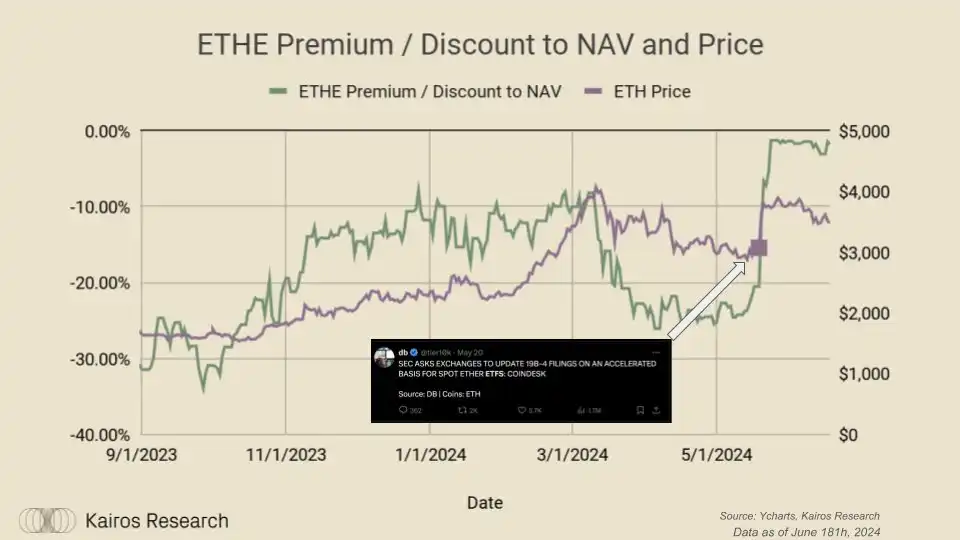 然而,当我们观察以太坊 ETF 的筹备情况时,发现情况几乎完全相反。直到 3 月 20 日,几乎没有市场讨论,而就在那天,彭博分析师将他们的胜算从 25% 提高到 75%。同一天,SEC 要求交易所为现货以太坊 ETF 做好准备的消息得到确认。随后,ETHE 价格飙升,三天后,上市正式获批。从那时起,ETHE 回到了接近其净资产价值的水平。