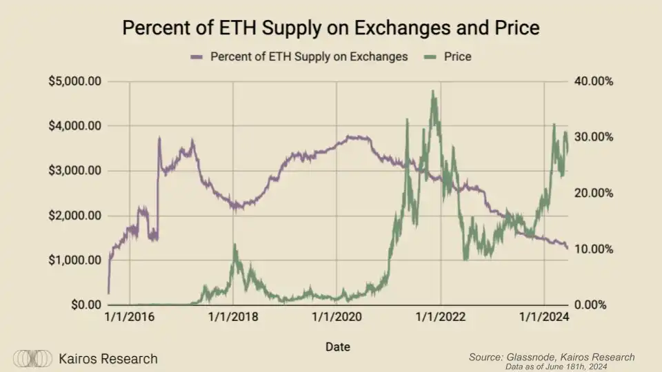 有一些人声称对 ETH ETF 几乎没有兴趣。虽然几乎没有数据支持这种说法,但有很多数据表明,西方,特别是美国人,迄今为止已经对 ETH 表现出了巨大的需求。例如,尽管 Binance 是用户基数和交易量最大的中心化交易所,但 Coinbase 拥有 140 万枚以上的 ETH(超过 47.5 亿美元)。为了进一步说明这一点,Kraken、Robinhood 和 Gemini(所有美国交易所)拥有的 ETH 比 OKX、UpBit、Bybit、BitThumb 和 Crypto.com 的总和还要多,还有 120 万枚 ETH 的盈余。根据 ethernodes.org 的数据,34% 的以太坊节点在美国运行。我们真正想表达的是,美国人喜欢 ETH,他们已经喜欢了一段时间,我们预计这种趋势将继续,并随着现货 ETH ETF 的推出而加强。