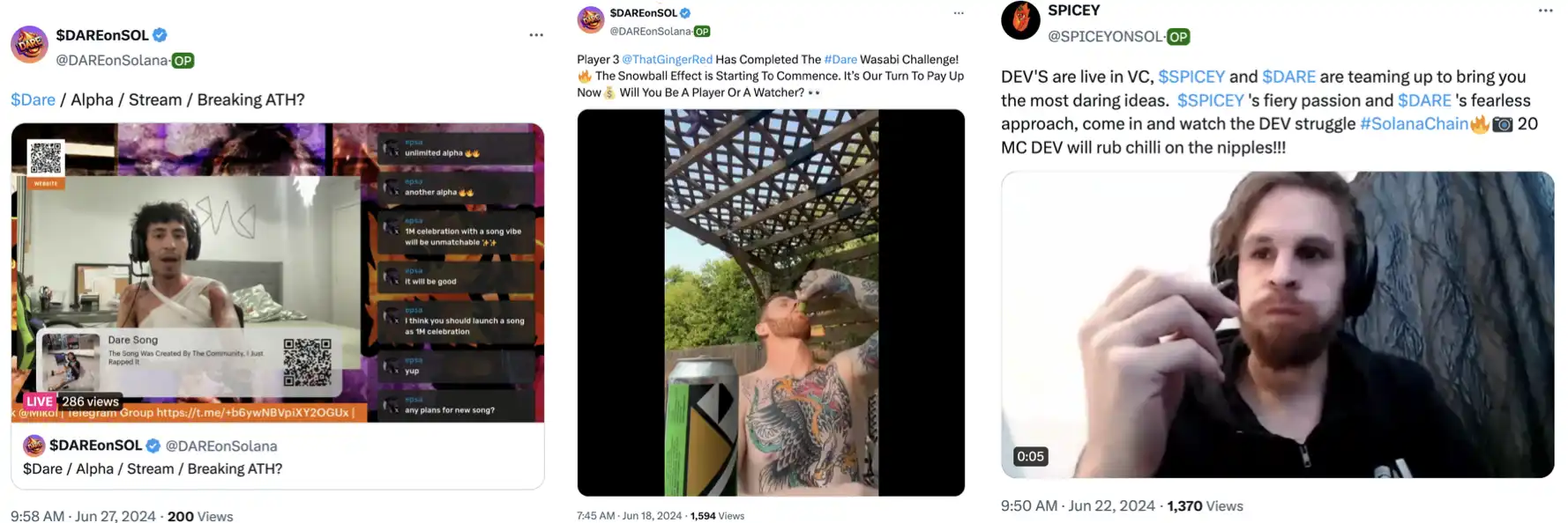 这个开发者名叫 Mikol,5 月 17 日,他在 Pump.fun 上推出了一个名为 TruthOrDare(DARE)的 meme 币,当时 Pump.fun 还没有直播功能,只能在评论区发布图片,Mikol 身体力行地向社区展示第一季「亮点」,它在 twich 上直播往身上浇异丙醇,让朋友向他的方向发射烟花。在粉丝的惊呼和 DARE 的上涨中,他的身体被点燃,全身三度烧伤送往医院。