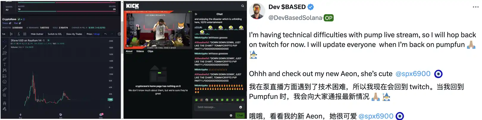 当下,尽管 Pump.fun 开通了评论区和直播功能,但用户登上 Pump.fun 只是为了完成买入或卖出这一个环节,对于 meme 币的讨论主要发生在推特上,有直播想法的 meme 币开发者也大都会选择 twitch、kick 等平台进行直播宣传。