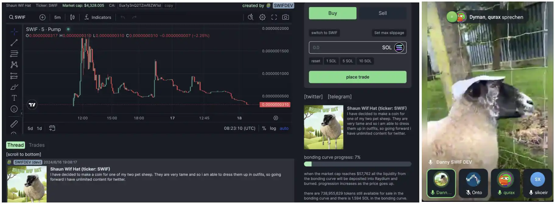 但 Web3 过往破灭的数个 x to earn 项目已经说明,再精巧的设计也不能挑战人性。6 月 13 日,曾有一位用户在 Pump.fun 上推出了以戴帽子的绵羊为主题的 meme 币,并在同期进行了直播。但直播刚刚开始一会后,评论区还在讨论绵羊的动作,而在代币发布时买入的狙击手迅速在高位卖出了大部分代币,使代币价格直线下跌。