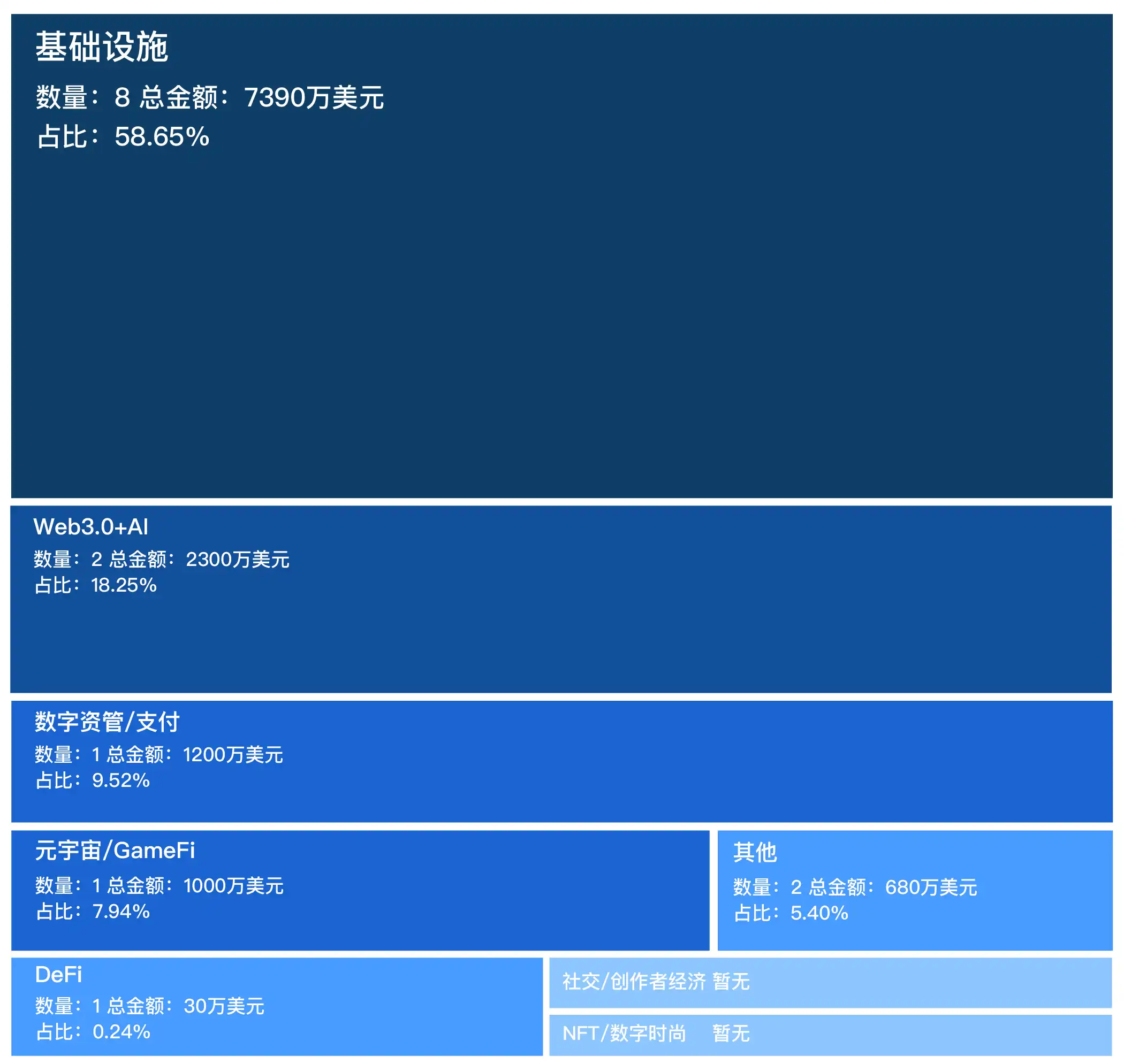 据 BlockBeats 统计,上周的融资总数为 15 笔,数量较之前减少,总金额约为 1.26 亿美元,平均融资金额为 840 万美元。其中,基础设施领域占据主体,Web3.0 AI 领域和数字资管/支付领域相对较多,元宇宙/GameFi 领域增多,其他领域融资和 DeFi 领域较少,NFT/数字时尚领域和社交/创作者经济领域暂无。下图为上周各板块融资占比: