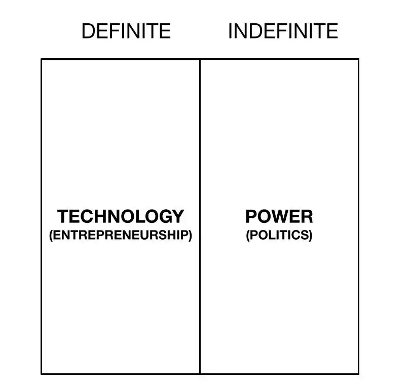 我将政治与科技框定为明确与不明确之间的垂直分界线。这是因为政治不是关于财富创造,而是关于治理和分配。充其量,好的政治是科技和创业的促进者。但它本身并不创造未来。科技才是。它是社会展开的基质,是人类之间信息交换的网络。