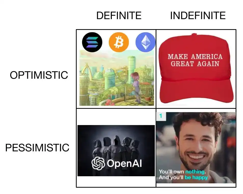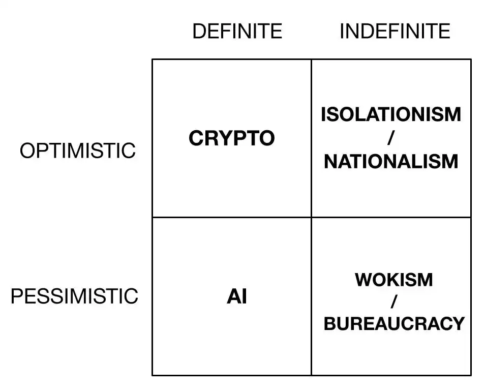 多年来,我在脑海中一直带着彼得·蒂尔关于乐观主义与悲观主义的简化 2x2 框架。当你有一把锤子时(任何东西在你眼里都像是钉子)蒂尔在明确和不明确的悲观主义和乐观主义之间做了区分。