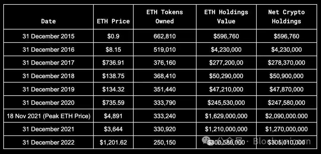 通过这些信息,我们可以估算他每年的持有量占总 ETH 供应量的百分比。以下表格显示了他每年 12 月 31 日的持有量作为相应年份的 ETH 持有量基准。他在 2023 年 12 月 8 日的持有量也包括在内,代表他最近已知的 ETH 持有量。
