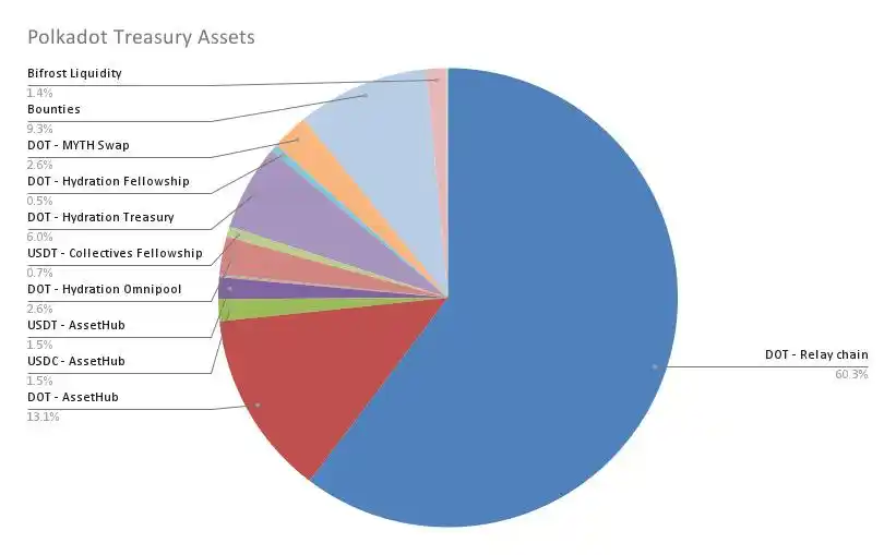 其中 1.88 亿美元(2900 万枚 DOT)为流动资产,包括 800 万美元的稳定币 USDT 和 USDC,主要分布在 Relaychain、AssetHub 和 Hydration 上;4700 万美元(730 万枚 DOT)指定资产由财政部用于特定用途;640 万美元(100 万枚 DOT)专用于 Omnipool(Hydration 旗舰 AMM);370 万美元(58 万枚 DOT)应收贷款为 DeFi 生态项目提供 1 年期贷款。