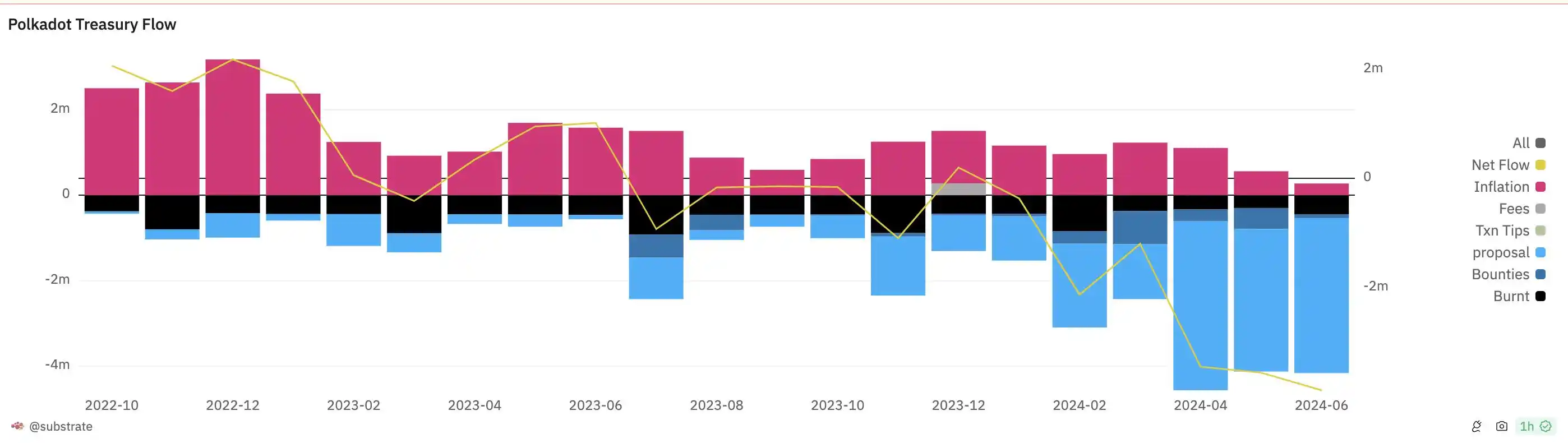 Ignas 认为,按照 Polkadot 目前的烧钱速度,不到两年就会面临破产。而根据 Polkadot 公布的数据显示,其在今年上半年的收入仅为 17.1 万枚 DOT(当前价值超 109.3 万美元),完全无法覆盖支出,仅占支出金额的 1.5%。且根据 Dune 数据显示,自 2023 年 7 月以来,Treasury 的资金流入就开始出现负增长,并在今年呈现扩大之势,仅在二季度就流出超 1091 万枚 DOT。