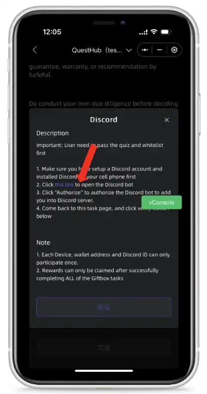 在活动中 Discord 任务页面,点击并点击任务中的跳转链接,页面将跳转至 Discord 的登陆授权界面,确认同意后,Discord 机器人会将你添加到 AirDAO 的 Discord 服务器。成功加入后,请回到 SafePal App 内的任务页面,点击「验证」按钮以确认任务完成。