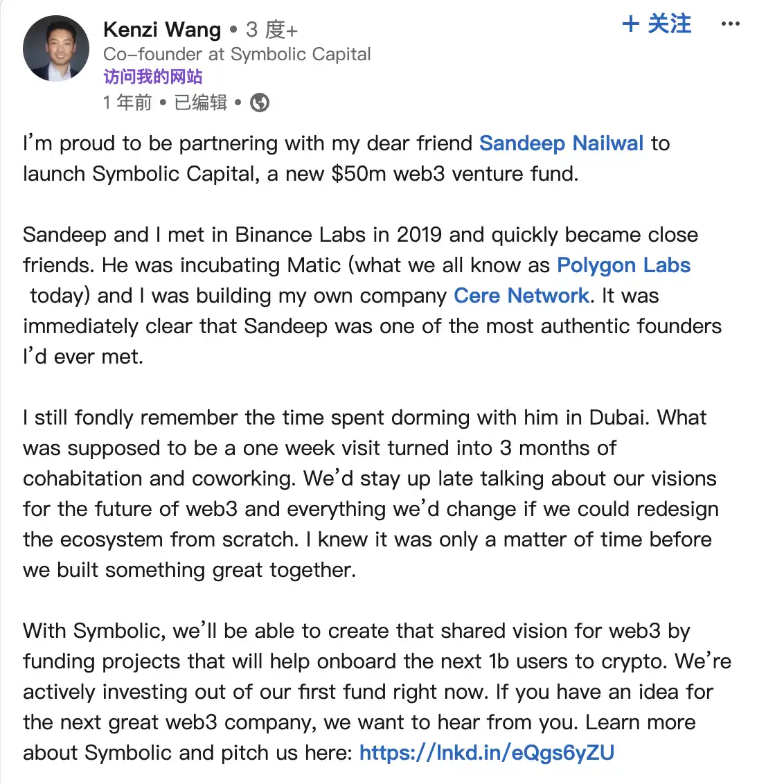 Kenzi Wang 此前是 Huobi Global 的副总裁和总经理,2019 年和 Sandeep Nailwal 在 Binance Labs 相识,后面投资了 Polygon Labs,还一起创办了 Symbolic Capital。