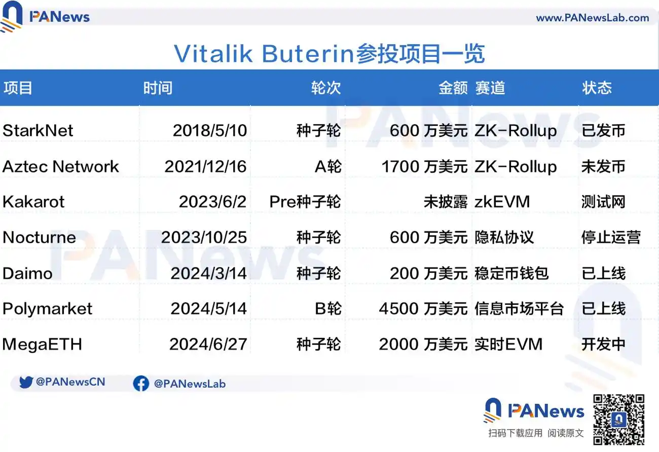 在 Vitalik 投资的 7 个项目中,基本都是围绕隐私协议、EVM、Layer2、钱包等加密基建具有创新的项目。这些项目中,仅有 StarkNet 已经发币,算是在财务上给 Vitalik 提供了回报。当中也有 Nocturne 这种昙花一现的,和 Polymarket 这种抓住风口的大热项目,还有 MegaETH 这种潜在的未来新星。