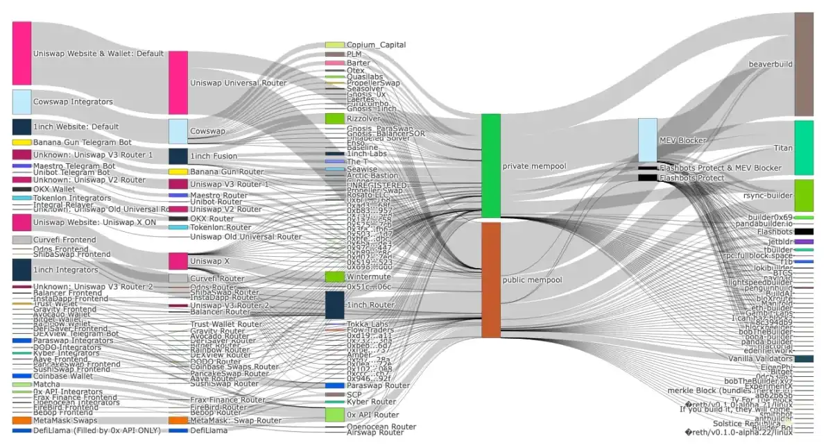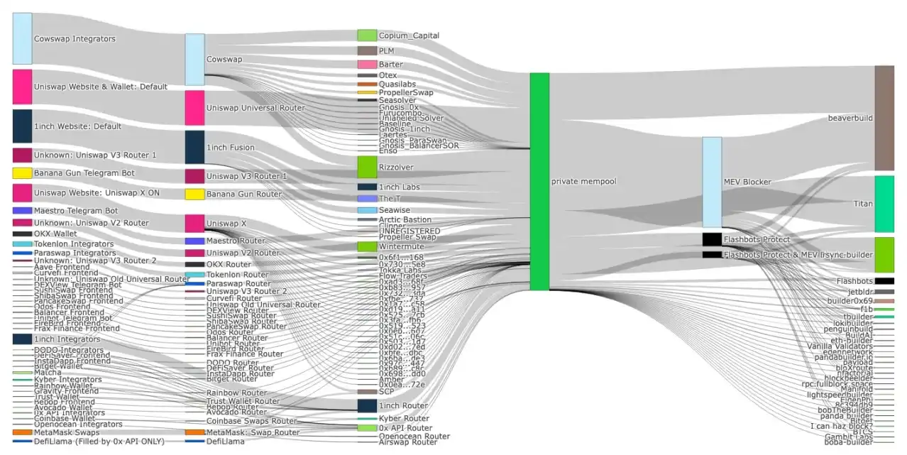 如果更细致观察,你会注意到大多数私有订单流来自前端(TG 机器人、钱包和前端)。