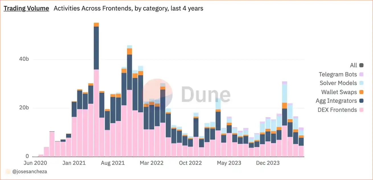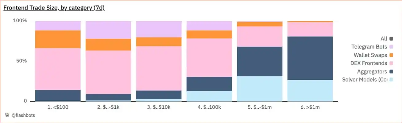 因此,交易场所出现了分化,便捷的前端(包括 TG Bots、钱包交换和 Uniswap 前端)主要用于长尾、低价值(低于 10 万美元)的交易,而聚合器和求解器网络则是大额交易的首选场所。