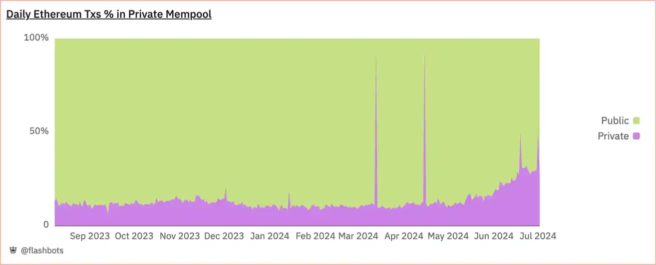 当我们考虑到只有 15-30% 的以太坊交易通过私有内存池时,订单流的私有化就更加明显,这意味着私有订单流交易量的很大一部分由少数交易贡献。
