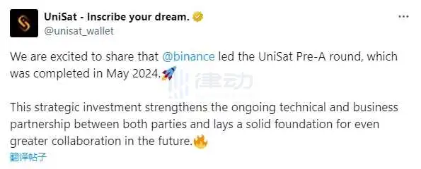 UniSat:已于今年5月完成Pre-A轮融资,Binance领投