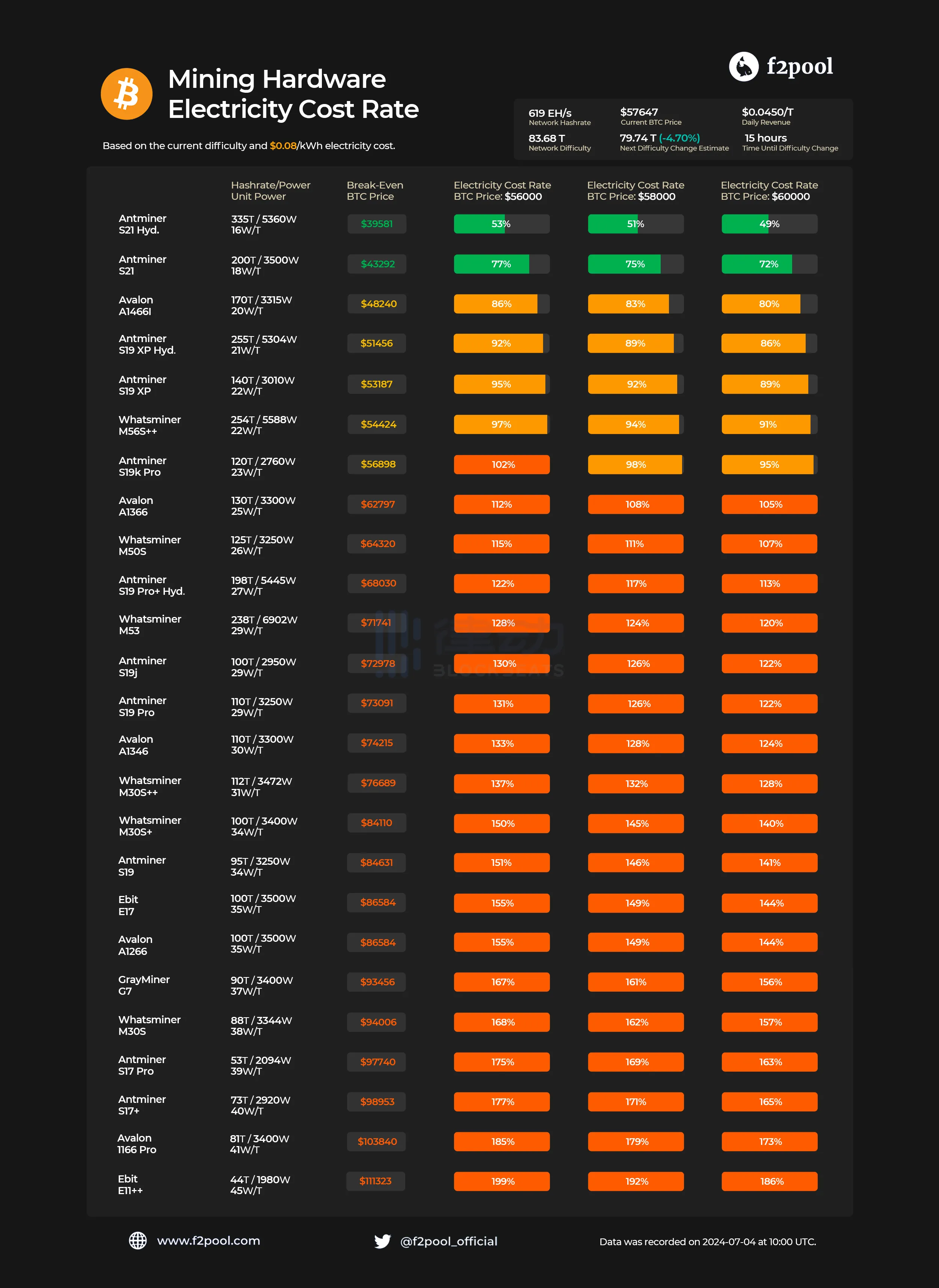 BlockBeats 消息,7 月 4 日,据 F2pool 数据,基于当前比特币挖矿难度和 0.06 美元/度电费价格计算,比特币矿机蚂蚁 S19、神马 M30S 、神马 M33S 等系列均已到达关机币价。