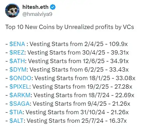 此前,数据分析平台 DYOR 的联创 hitesh.eth 于 X 上贴出了一组数据,盘点了当前市面上较为典型的十大「VC 代币」。