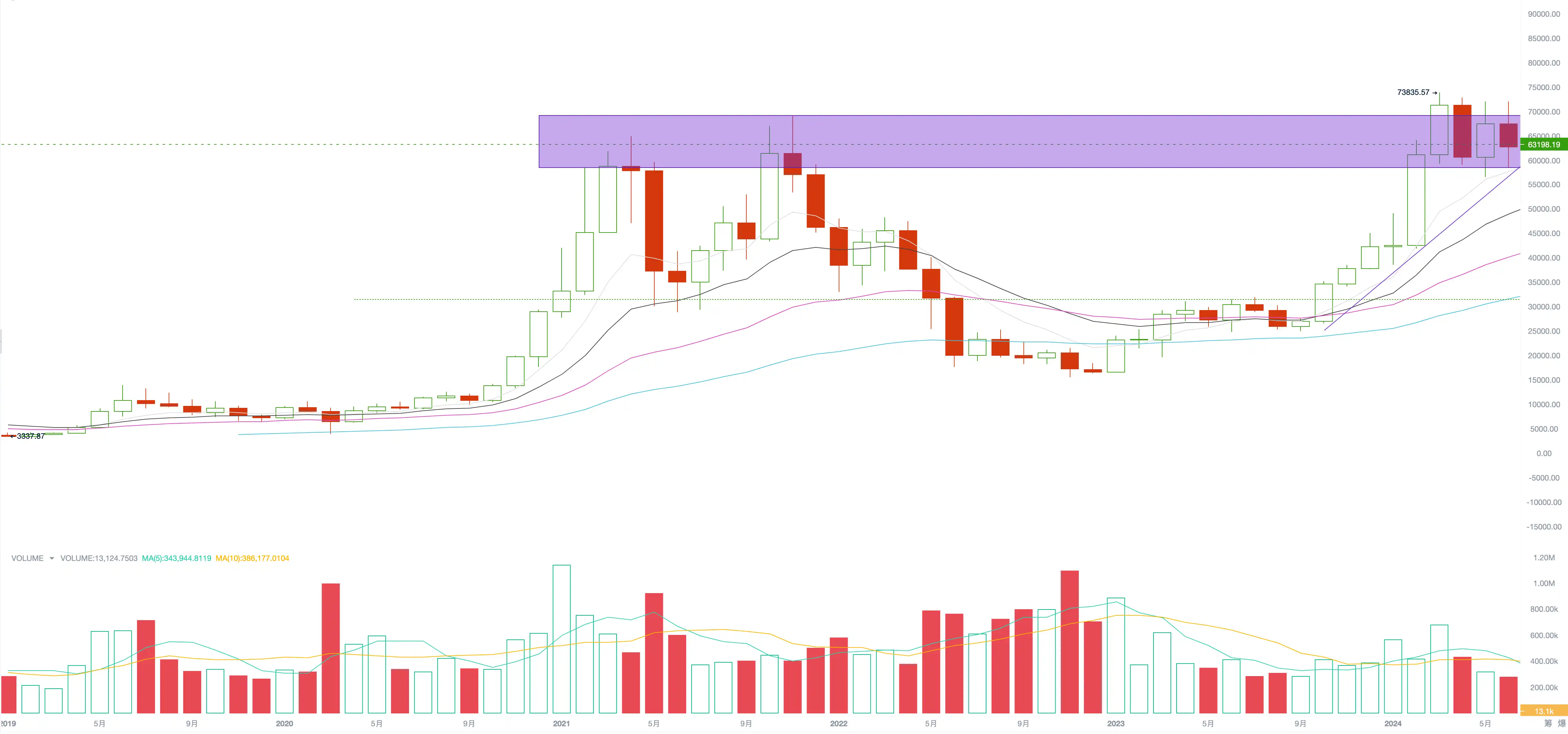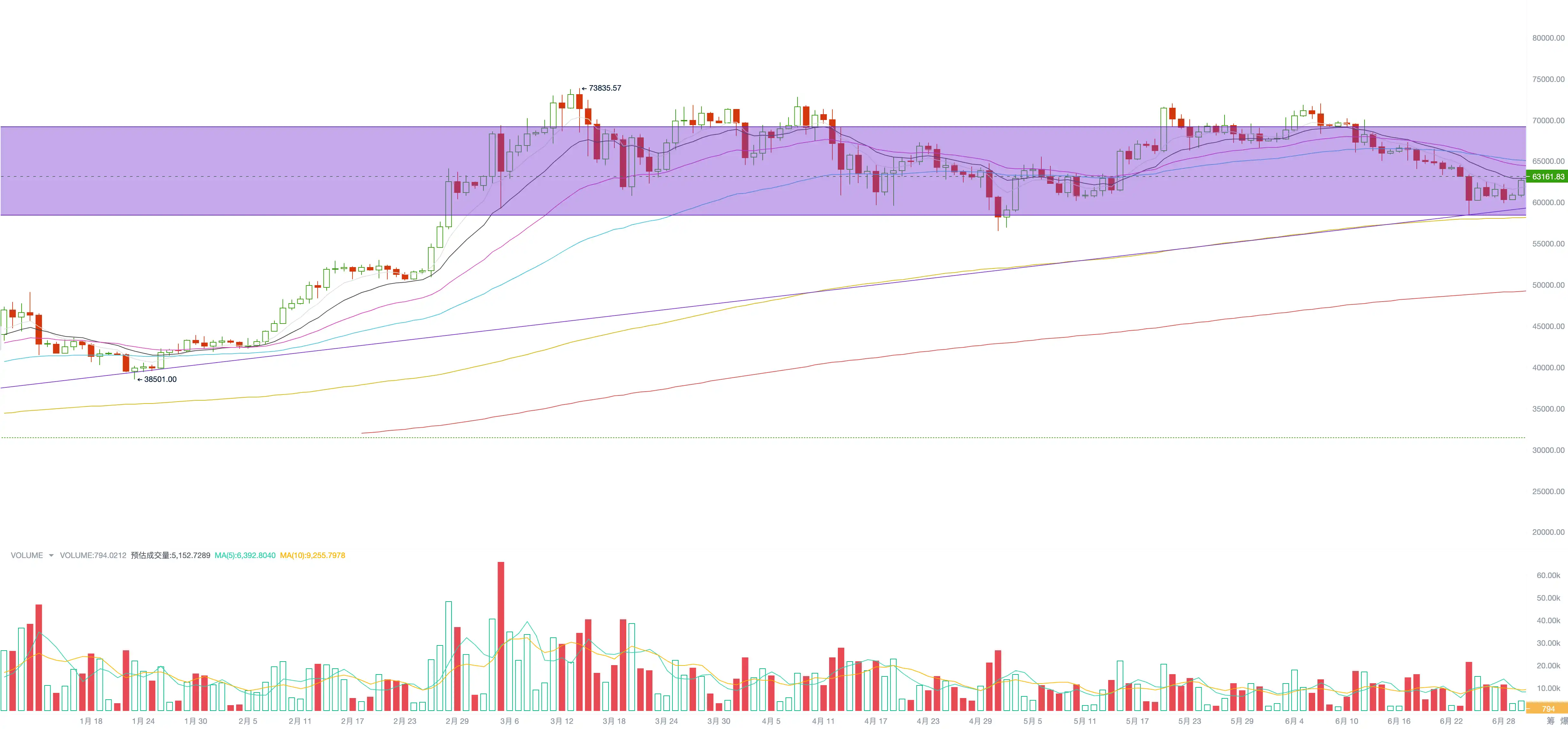 6 月,BTC 开于 67473.07 美元,收于 62668.26 美元,全月下跌 4804.15 美元计 7.12%,振幅 20.10%,成交量连续 3 个月萎缩。