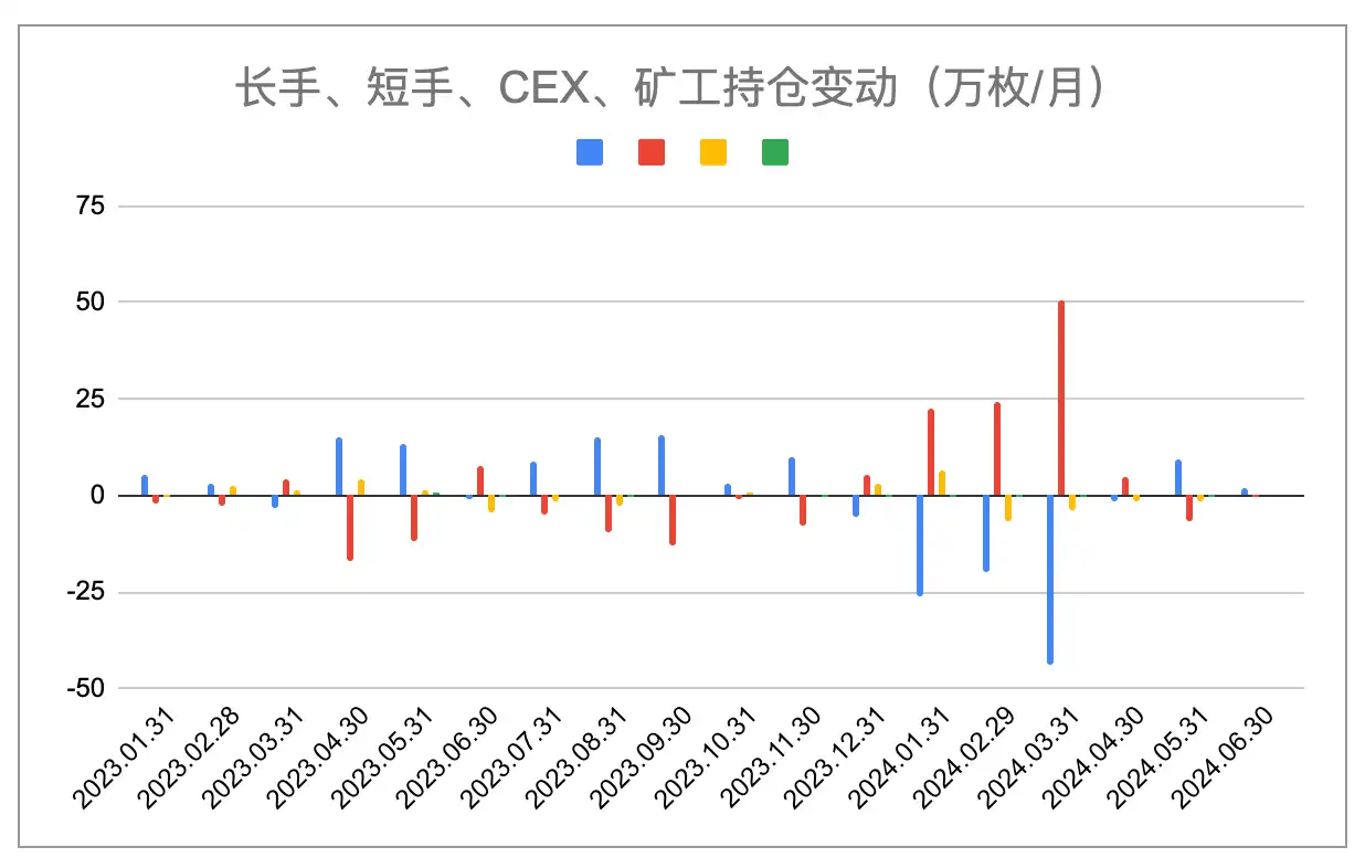 对去年以来长期投资者、短期投资者、交易所和矿工群体持仓进行分析,我们发现在 2023 年全年的前 11 个月长期投资者都在增仓,而短手在减仓。转折点发生在 12 月,这一月 BTC 价格逼近前期高点,长期投资者群体开始分发筹码,而短手群体开始增持。伴随 BTC 价格在 3 月创出历史新高,这种筹码交换的游戏达到顶峰。之后价格开始崩溃,长期投资者 4 月抛售规模迅速萎缩,在五、六月这种抛售完全结束,长期投资者重新开始增持筹码。
