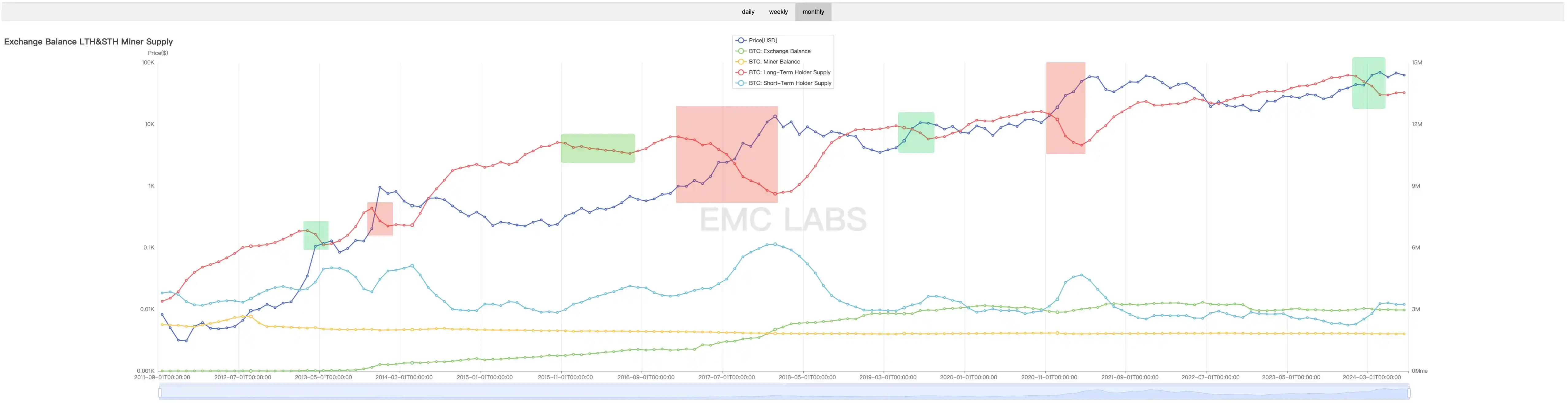 长期投资者、短期投资者、交易所和矿工持仓变动分析(EMC Labs 制图)