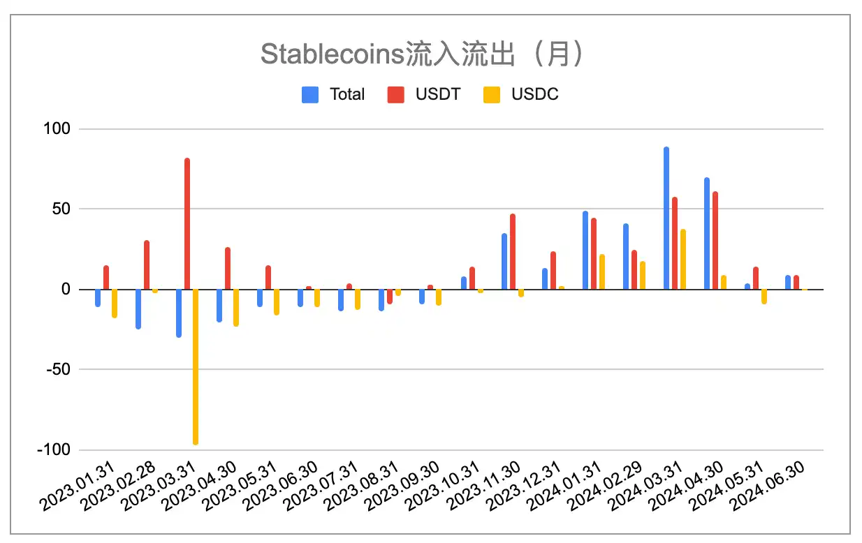 2023.10~2024.01:在 BTC ETF 获批及减产预期推动下,稳定币净流入转正,之后持续上涨,推动 BTC 价格由 32000 美元抬升至 49000 美元;