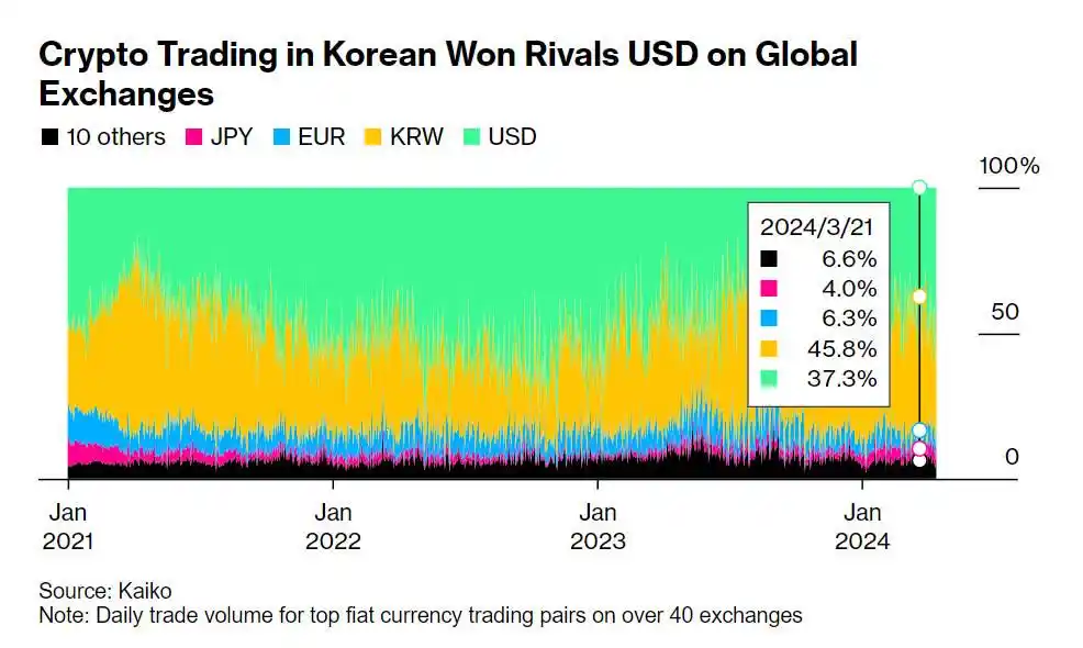 韩国加密货币市场的重要性正在与日俱增。2024 年第一季度,韩元是全球最活跃的对加密资产交易货币,超过美元。研究公司 Kaiko 的数据显示,2024 年第一季度,韩元在中心化加密货币交易所的累计交易额为 4560 亿美元,而美元交易额为 4450 亿美元。