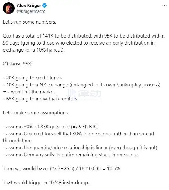 BlockBeats 消息,7 月 9 日,加密分析师 Alex Krüger 在其社交平台对门头沟和德国政府抛售比特币可引发的下跌幅度进行分析测算。