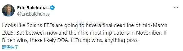 BlockBeats 消息,7 月 9 日,彭博分析师 Eric Balchunas 在其社交平台表示,Solana ETF 的最终截止日期是 2025 年 3 月中旬。「但在此期间,最重要的日期是 11 月。如果拜登获胜,这些 ETF 很可能会被否决。如果特朗普获胜,一切皆有可能。」