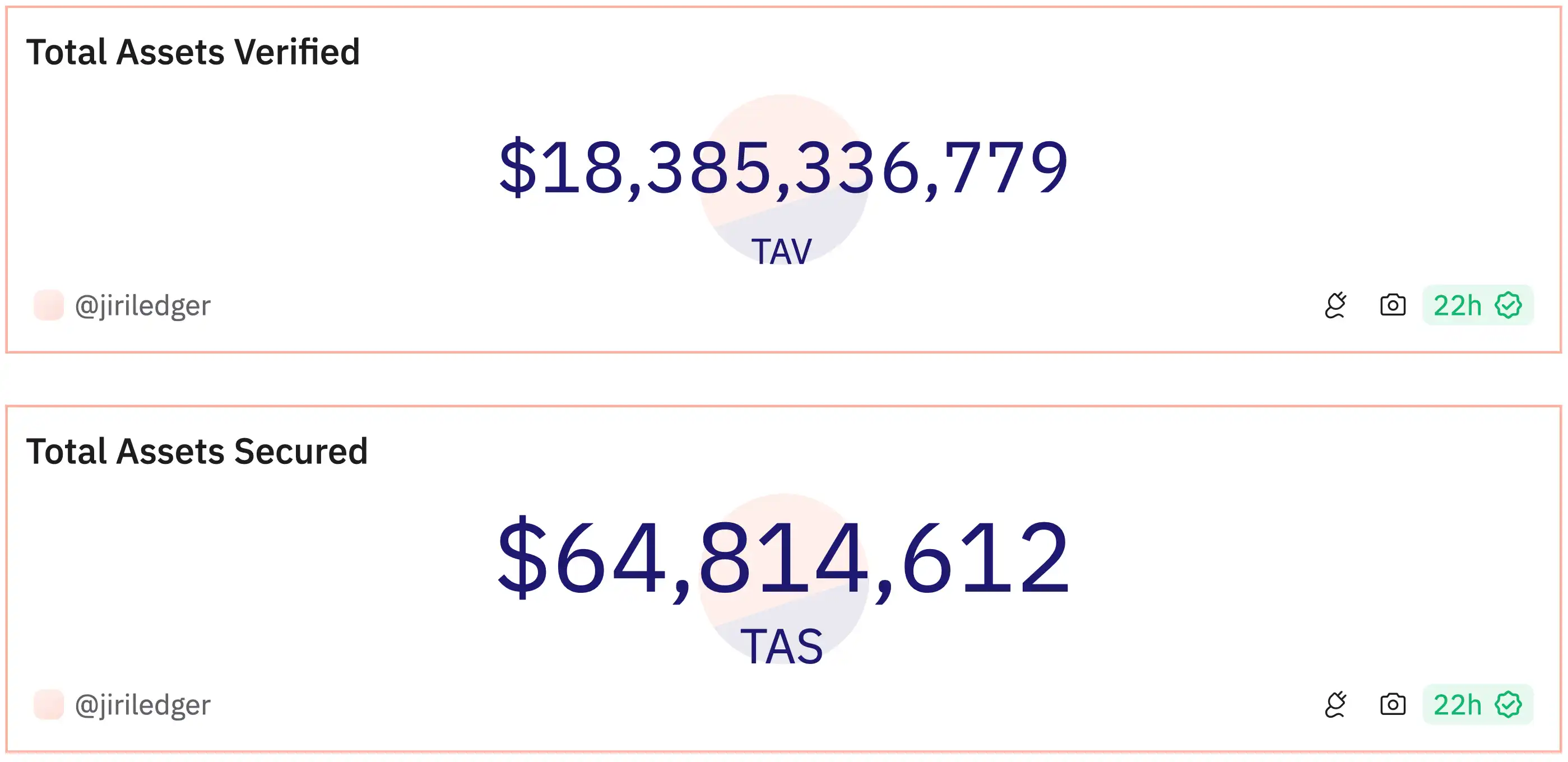 在此基础上,Jiritsu 还通过「已验证资产总价值」(Total Asset Verified)和「已锁仓资产总价值」(Totl Asset Secured)两个数据指标来衡量其对现实世界资产上链的影响力,并用这些数据指标,为 DeFi 协议提供更具兼容性和互操作性的底层资产乐高。根据官方提供的Dune 看板数据,截至目前 Jiritsu 已经验证了超 180 亿美元的资产,并有超 6000 万美元资产随时等待各类协议使用。