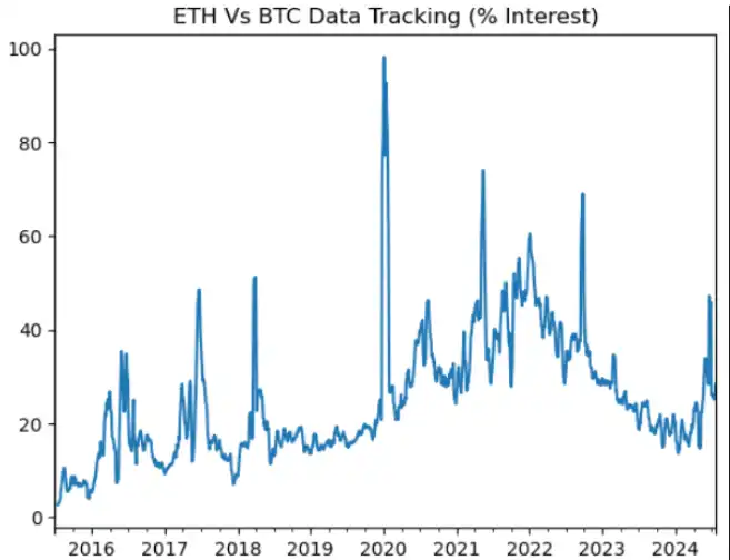 上图显示了最近的谷歌趋势,认为我们可以现实地达到总兴趣的 20-30%(如果 ETH 真正上涨,甚至更高,如我们在 5 月批准时所见)。