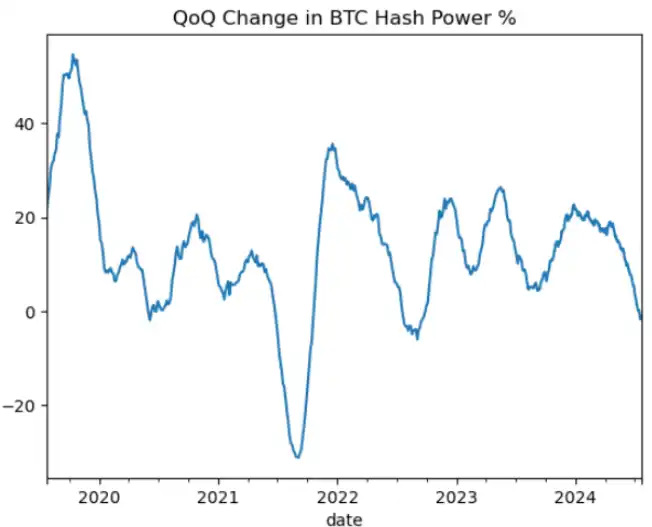 比特币哈希率 84 天移动平均变化百分比(注意 - 最近哈希率开始恢复,这对 BTC 有利)