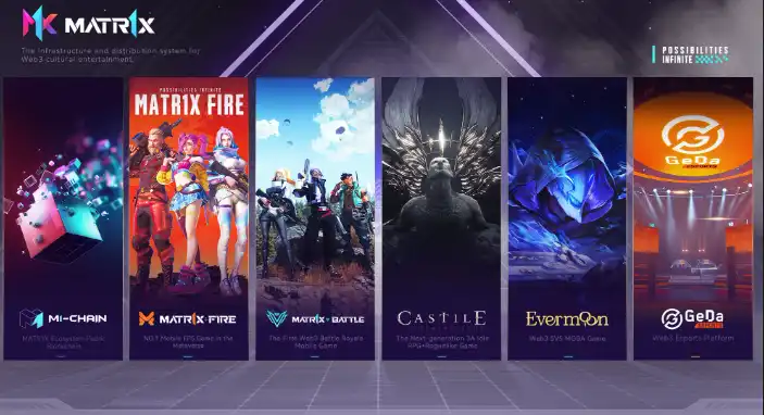 MATR1X 己拥有 MATR1X FIRE 、MATR1X BATTLE、Castile、Evermoon 四款 3A 级游戏,MATR1X FIRE 是经典射击手游,MATR1X BATTLE 是大逃杀类吃鸡手游,Castile 是 3A 放置类卡牌,Evermoon 是 5V5 MOBA.