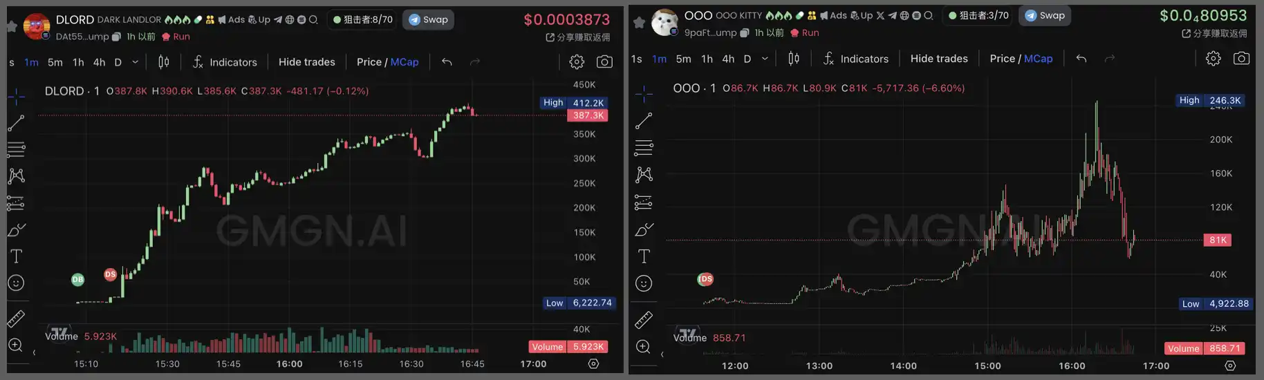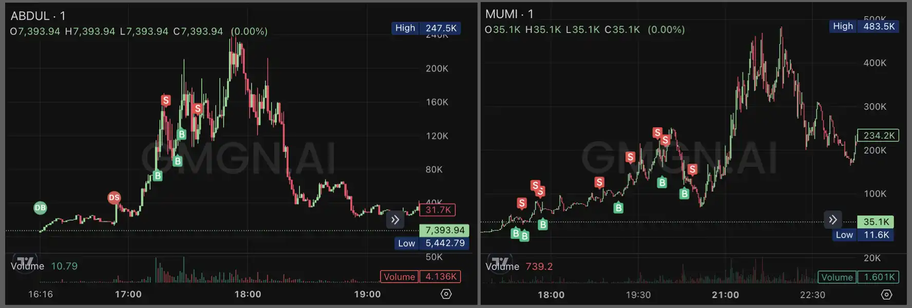 一个交易者在 meme 币 ABDUL 和 MUMI 上的交易记录,最高市值分别为 247.5K 和 483.5K