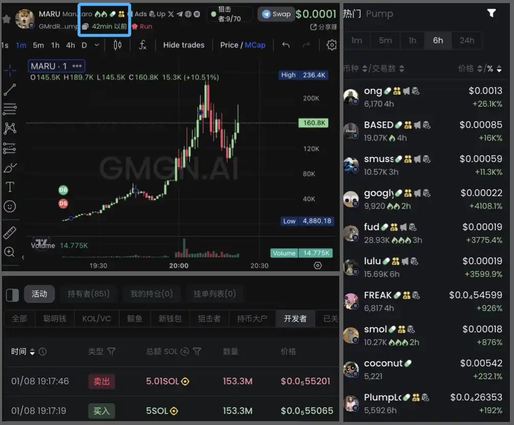 比如下图的 MARU,dev 在代币上线后很快买入,但仅持有了 27 秒就全部清仓,用 5SOL 的成本只赚取了 0.01SOL(约 2.08 美元)的利润。dev 卖出之后,MARU 开始上涨,50 分钟内涨幅 20 倍。