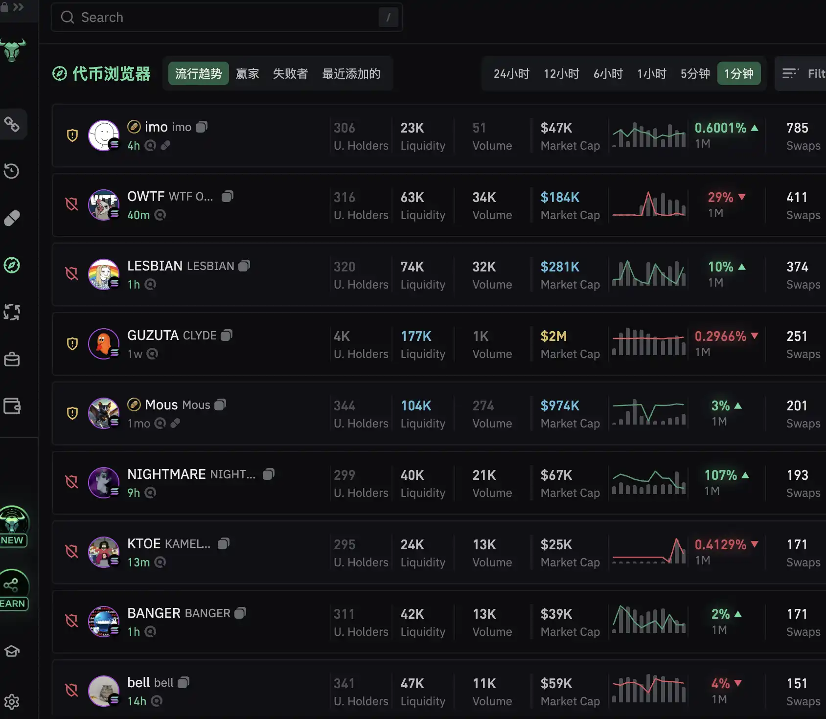 查看代币走势只是这些工具最基本的功能。冲 meme 的准备工作可以分为「从币找人」和「从人找币」,在这个需求上,有的工具适合做看板、分析筹码分布,有的工具在提示地址异动上更加灵敏,还有的在交易速度上表现更佳。