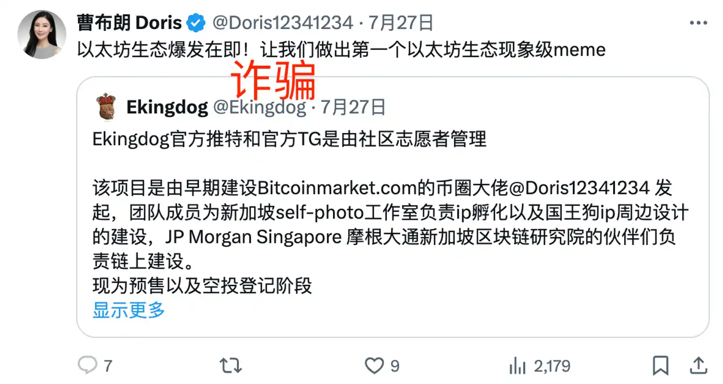 这个盗窃小红书美女照片,伪装叫「曹布朗 Doris」的诈骗者在看到 Rita 揭露整个骗局的推文后,也发出推文进行反驳,并使用小号进行互动灌水,然后立刻发起了一个「Ekingdog」的 MEME 币空投和私募。