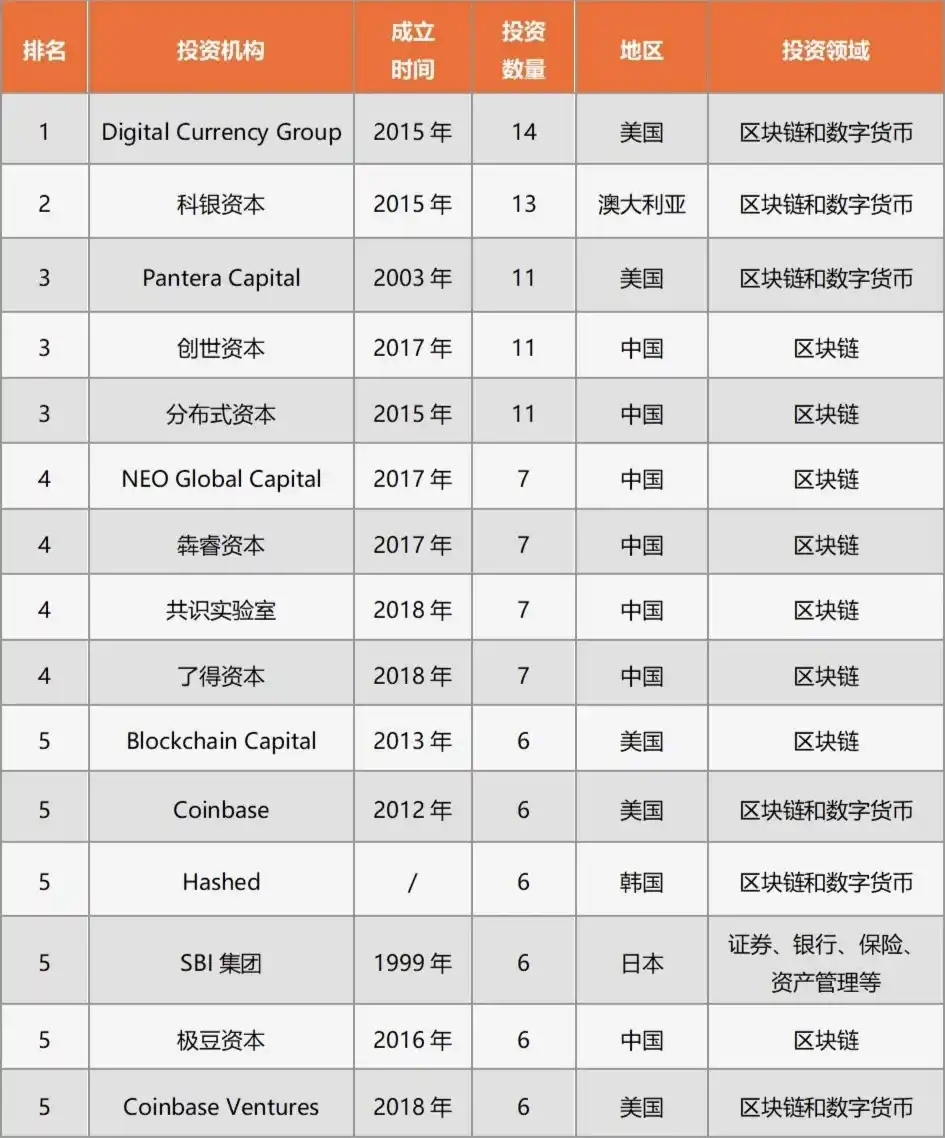 另外,从投资机构方面来看, 2019 年也是「嬗变之年」——海外投资机构逐渐与中国投资机构分庭抗礼,美国投资机构 Digital Currency Group 以 14 笔投资成全球最活跃的投资机构,甚至成立于 2012 年的美国加密交易所 Coinbase 和旗下成立于 2018 年的 Coinbase Ventures 分别以 6 笔投资共同名列机构名单前列,这也为下一波 DeFi 浪潮的开启埋下了伏笔。