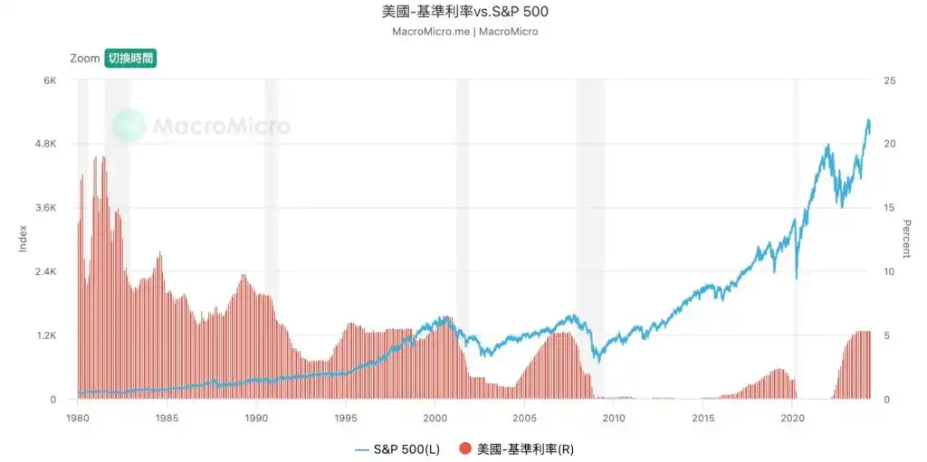 · 2000 年的网路泡沫,SP500 指数也是随著利率同步下滑的。