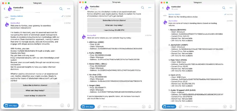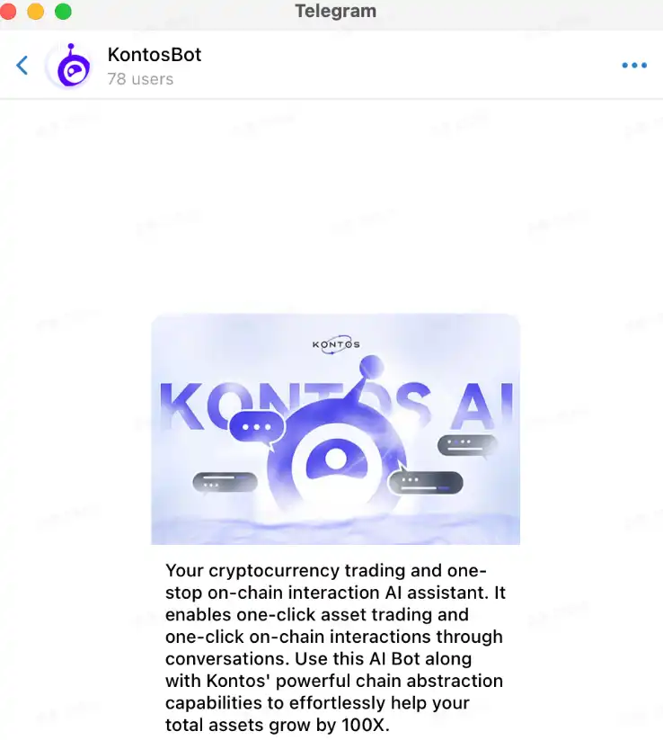 以Telegram平台为例,目前Kontos AI Agent在Telegram平台已经上线,用户可以直接访问。