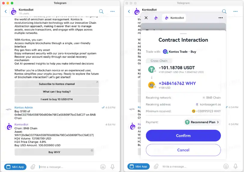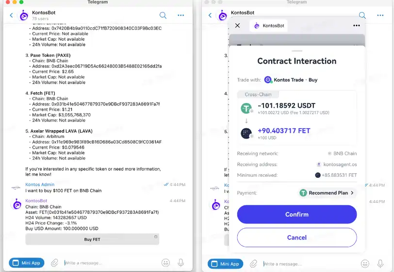 而当用户决定购买某个代币时,如“我想要买100刀在BNB链上的FET”,Kontos AI将自动唤起Kontos Mini App,并跳转到交易页面,用户点击确认即可发起该交易。