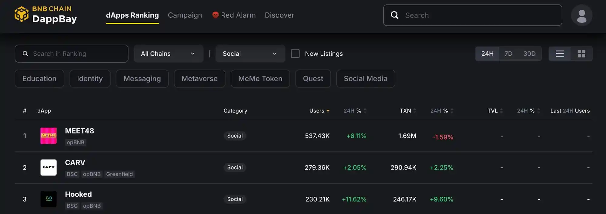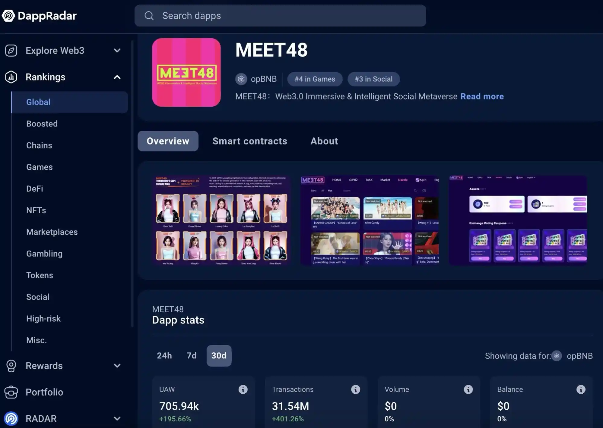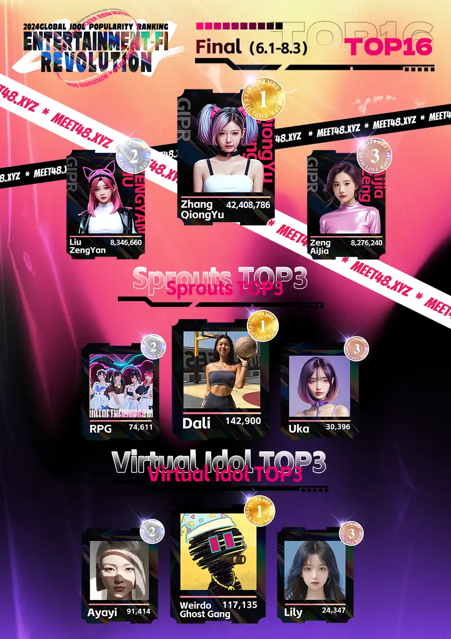 8 月 3 日,基于 AI 和 WEB3.0 多样化 UGC 娱乐内容生态的元宇宙虚拟社区 MEET48 的”2024 GIPR2“投票活动正式落下帷幕,公布了偶像组、素人组以及虚拟人组的 top 参赛者排名和出席后续多个由 MEET48 主办或合作的全球大型 Web3 活动的推广计划。MEET48 投票活动 Dapp 的链上数据和在 DappBay 和 DappRadar 上的排名表现出色,引起了广泛关注。