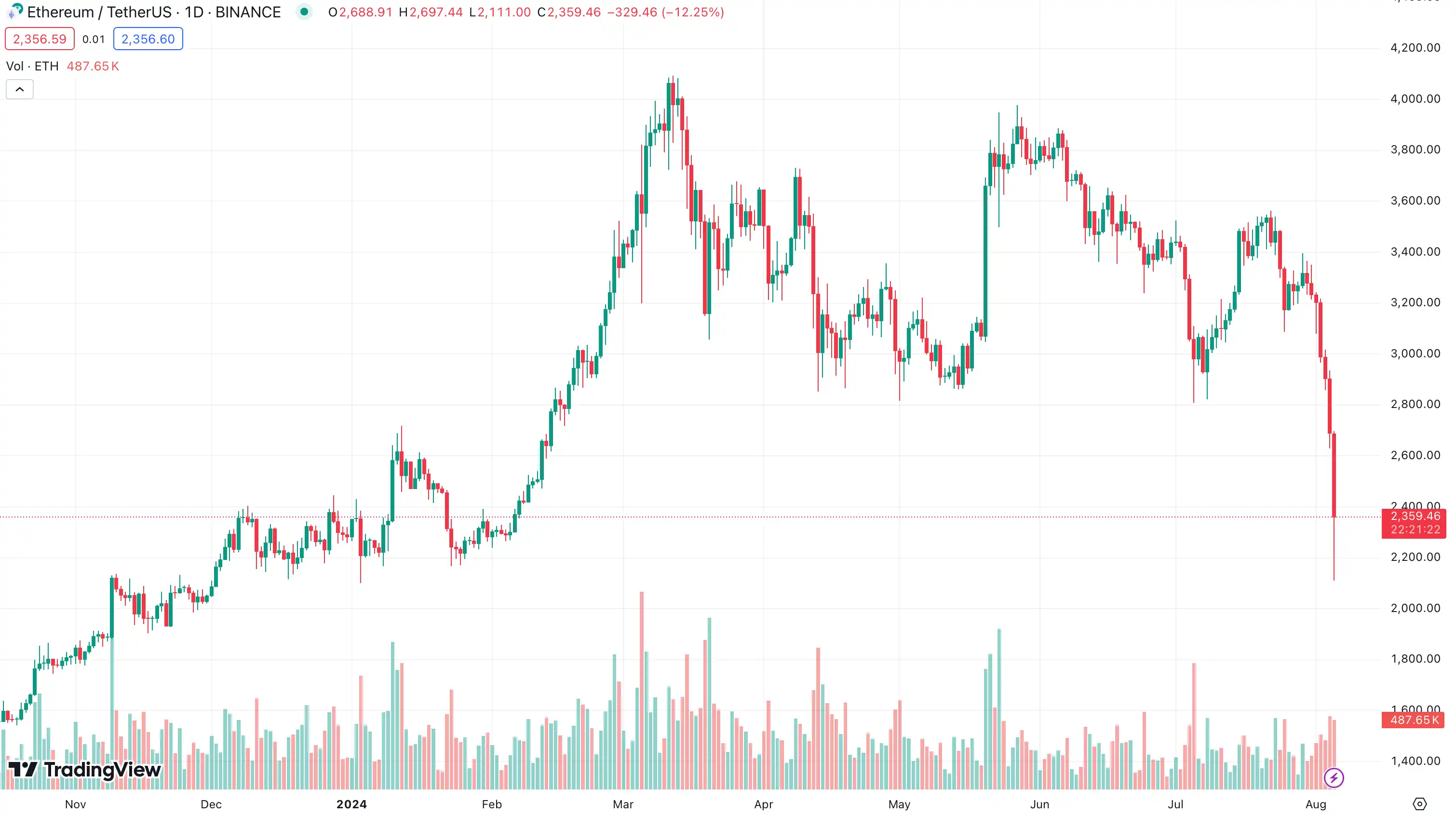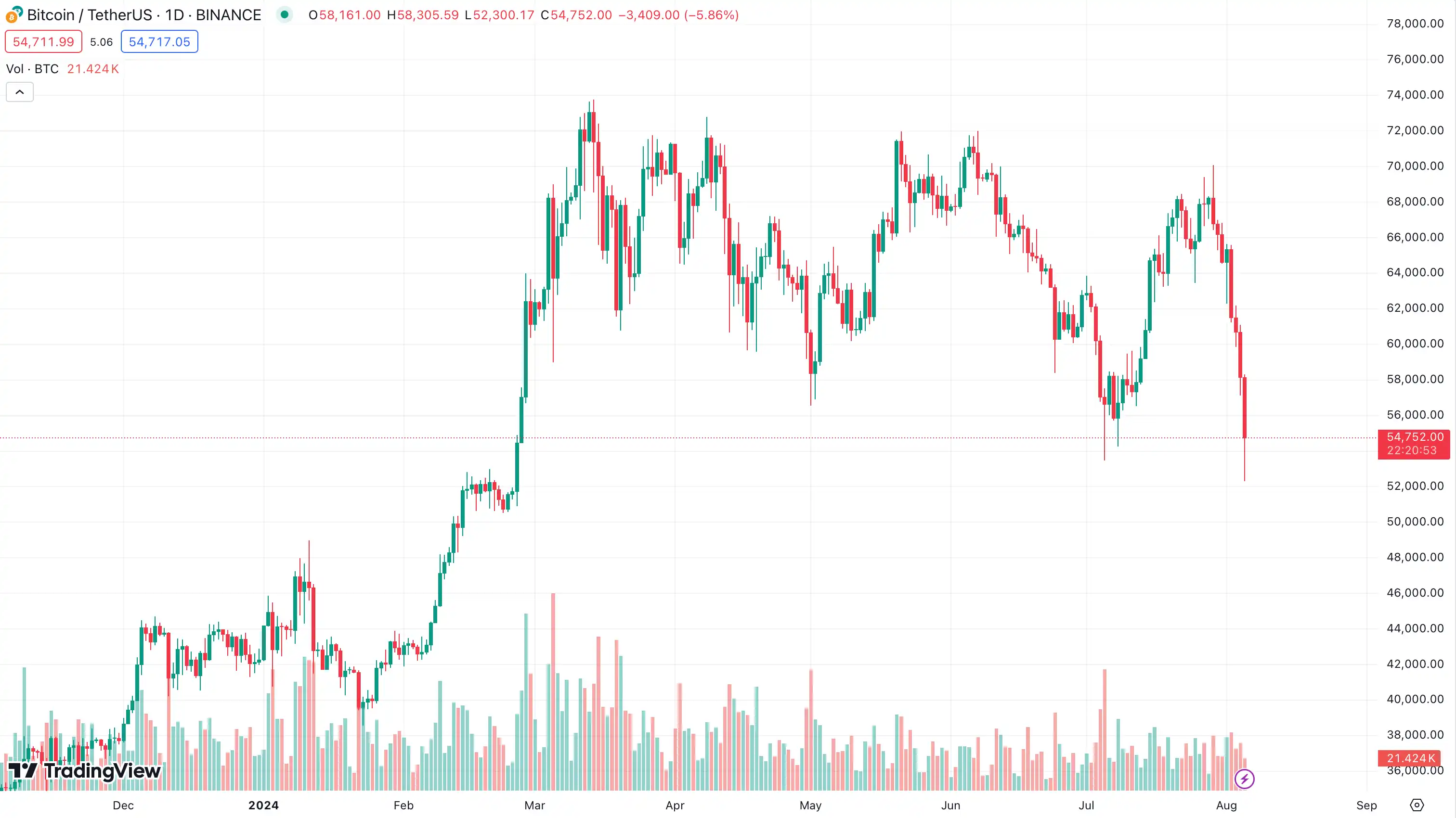 比特币继昨日跌破 60,000 美元后,在今日又跌破 53,000 美元,截至撰稿时报价 54,752 美元,以太坊更是暴跌 12.9%,跌破 2300 美元。加密市场全线下跌,OP、AVAX、ENS 等高市值标的,以及 AEVO、ZK、W、REZ、SAGA、OMNI、IO 等新币均下跌约 10%,创上线以来新低,相较之下,SOL 仅下跌 4.9%,表现相对坚挺。