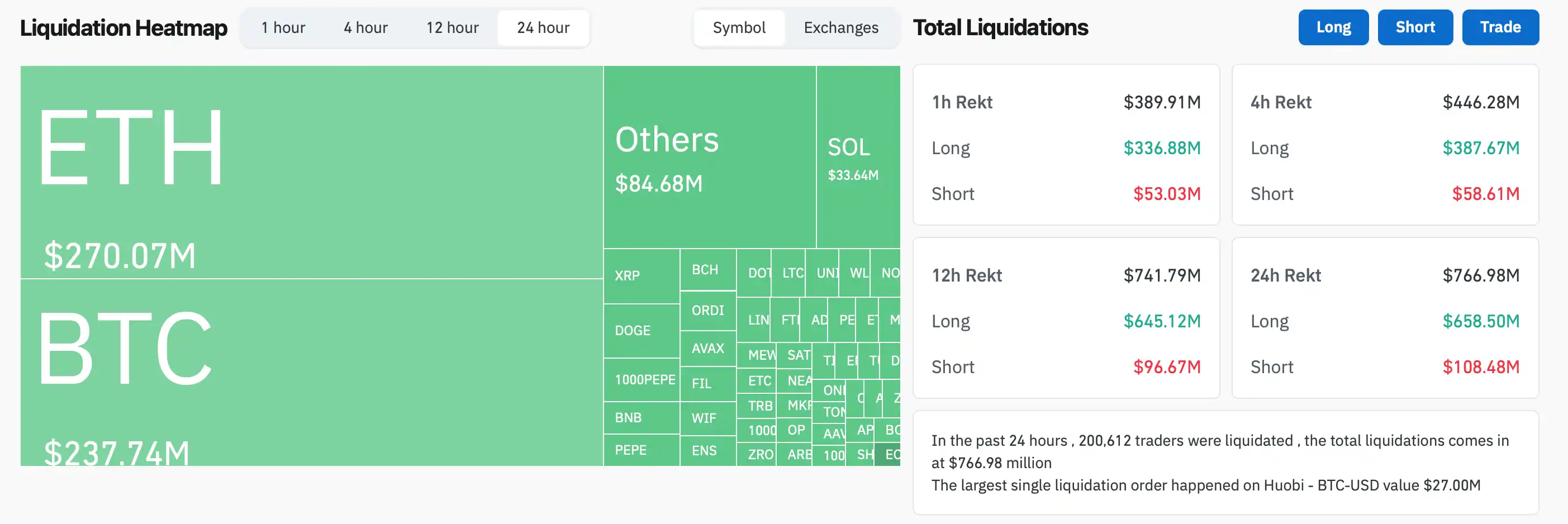 据 Coinglass 数据显示,过去 24 小时全网爆仓约 7.67 亿美元,其中多单爆仓 6.58 亿美元,空单爆仓 1.08 亿美元。