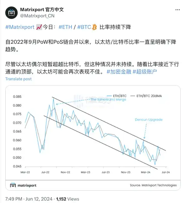 6 月 12 日,Matrixport 官方发文表示,自 2022 年 9 月 PoW 和 PoS 链合并以来,ETH/BTC 汇率一直呈明显下降趋势。尽管以太坊偶尔短暂超越比特币,但这种情况并未持续。随着汇率对接近下行通道的顶部,ETH 可能会再次表现不佳。