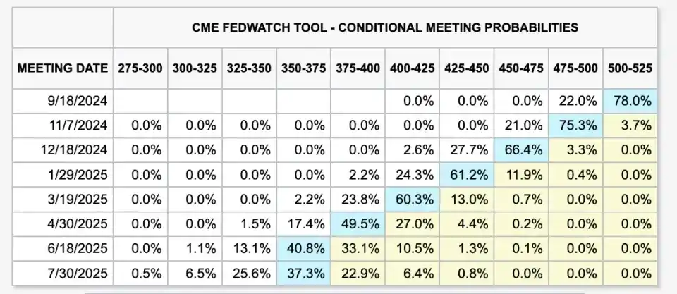 芝加哥商品交易所实时更新的美联储监测工具显示,目前市场预期美联储在 9 月份议息会议上宣布降息 25 个基点的概率为 78% ,降息 50 个基点的概率为 22% 。到今年年底最后一次美联储议息会议,市场预计届时累计降息 125 个基点的概率已经有 2.6% 。