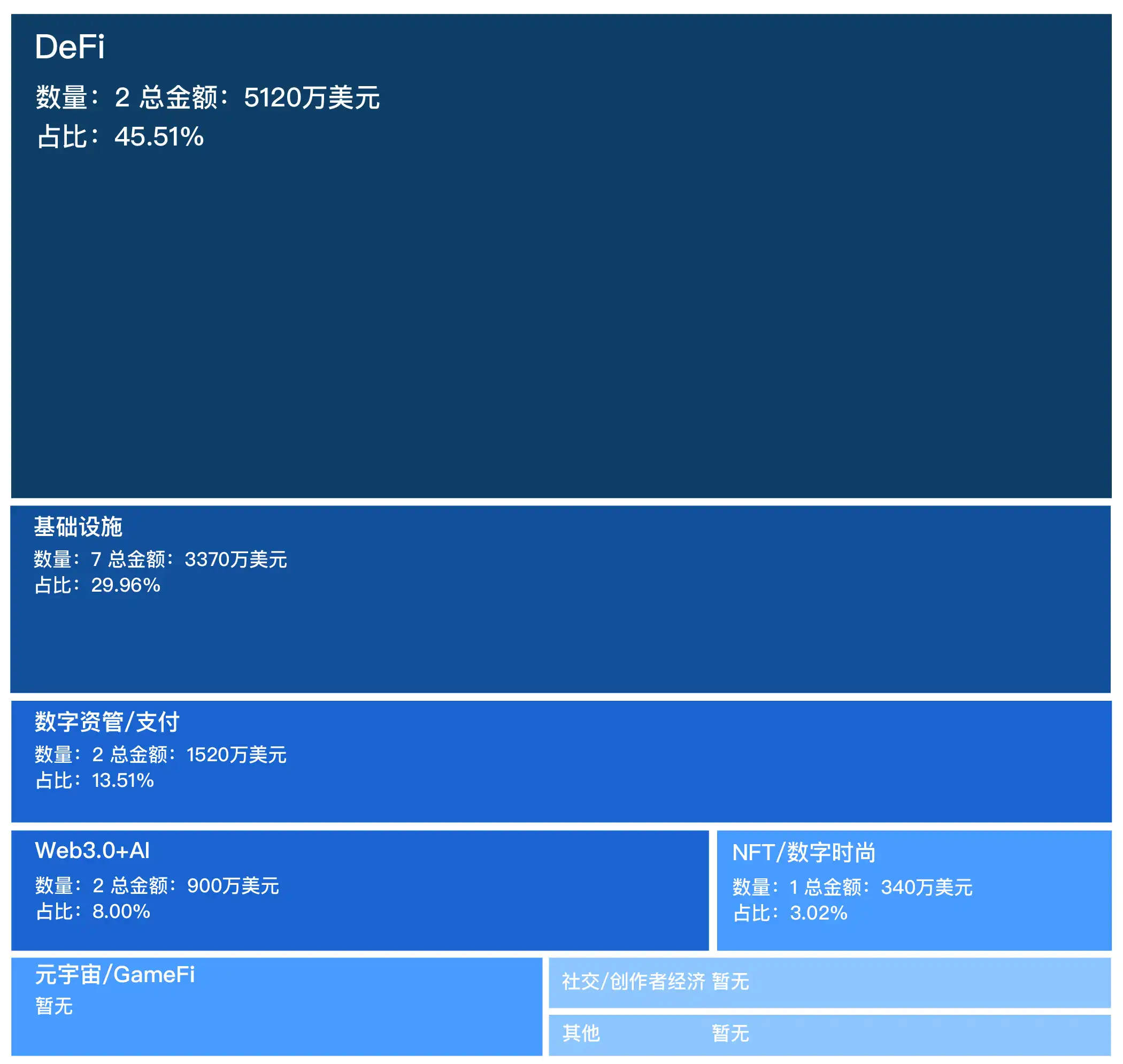 据 BlockBeats 统计,上周的融资总数为 14 笔,数量较之前减少,总金额约为 1.125 亿美元,平均融资金额为 803.57 万美元。其中,DeFi 领域占据主体,基础设施领域相对较多,数字资管/支付领域增多,Web3.0 AI 领域和 NFT/数字时尚领域较少,元宇宙/GameFi 领域、社交/创作者经济领域和其他领域融资暂无。下图为上周各板块融资占比: