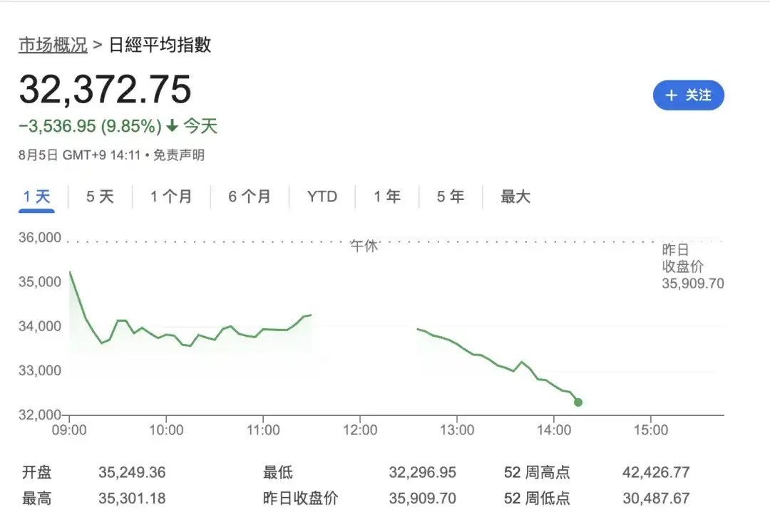 日本股市出现史诗级暴跌,日经指数狂泻 9%,日本东证指数两次触发熔断机制,创下八年来最大单日跌幅。