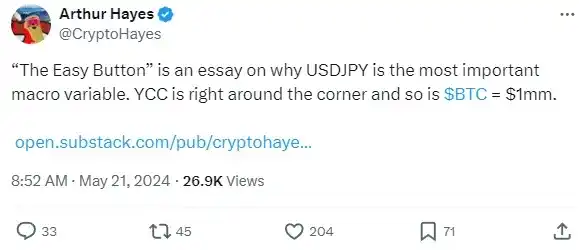 5 月份,BitMEX 创始人 Arthur Hayes 曾经写过一篇文章唱多比特币,认为日元疲软或将比特币推至 100 万美元。