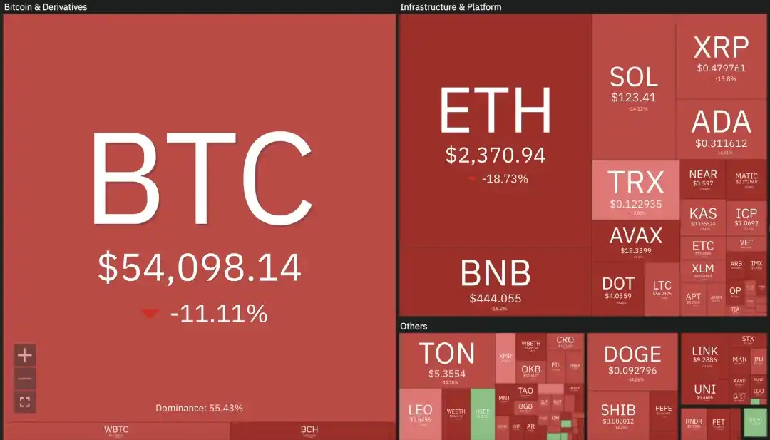 比特币一度跌至 54000 美元附近,以太坊一度跌至 2100 美元附近,单日跌幅近 20%,24 小时爆仓 8 亿美元,整个加密市场市值跌破 2 万亿美元。