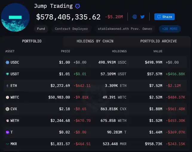 据 Arkham 显示,在 2021 年年底的巅峰时间,Jump 的地址里有接近 100 亿美元,而如今同样这个地址中仅有不到 6 亿美元的资产。而这 5.95 亿美元仓位里,已大幅转向稳定币,USDC 和 USDT 的持仓占比已达到 96%。