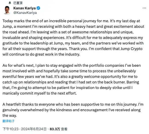 在传出 CFTC 对 Jump Crypto 展开调查消息的几天后,Jump Crypto 的年轻 CEO Kanav Kariya 宣布了他将离职的消息。这位曾在公司内部担任关键角色的小将,通过推特表达了他在 Jump 这段旅程中的复杂情感以及对未来的展望。